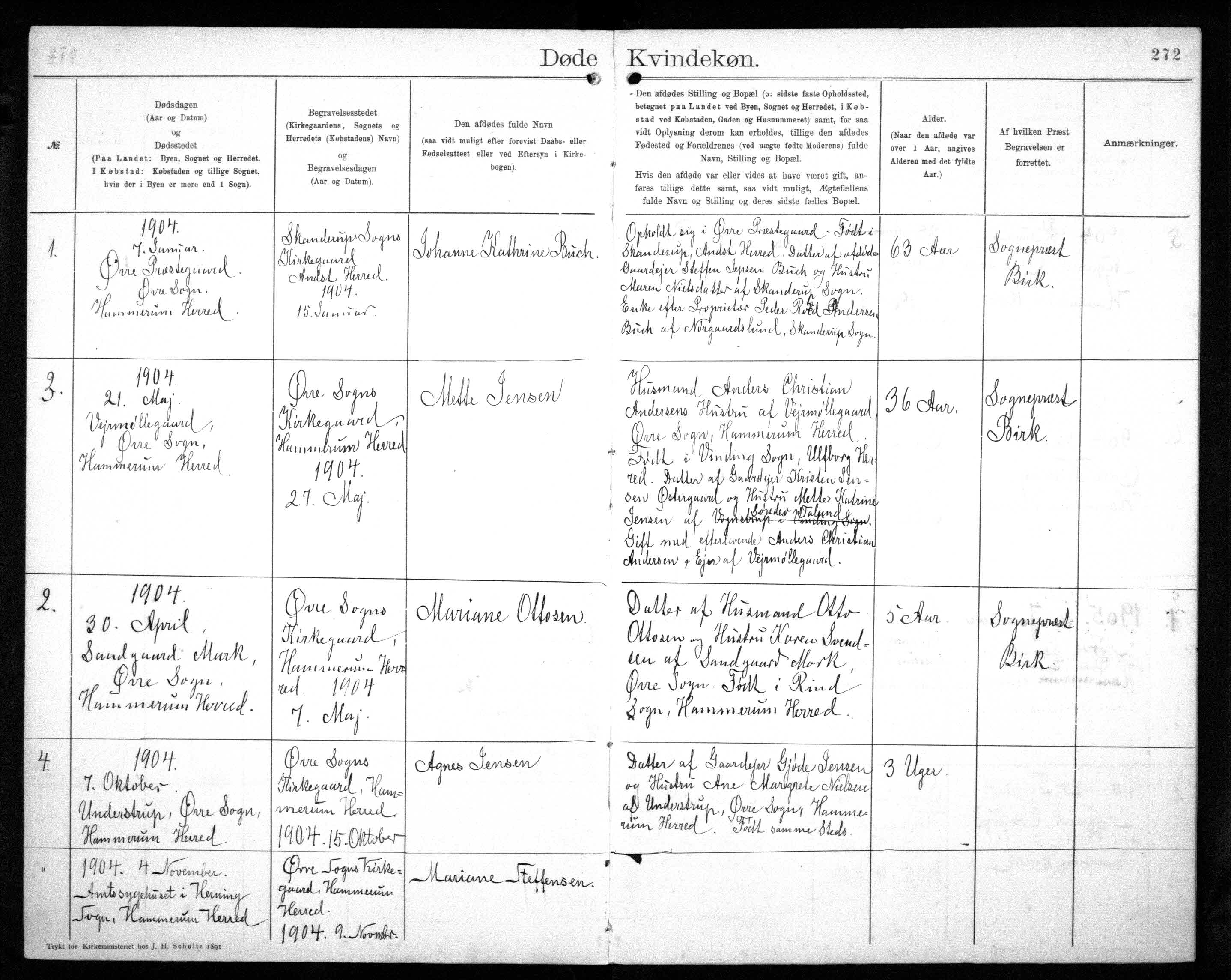 Kontraministerialbog, Ørre, Hammerum, Ribe, Døde Kvindekøn 1892-1912, folio 272, Arkiv: Rigsarkivet, Arkivalier Online. Udarb. dato: 1 dec. 2019. Troværdighed: 4.