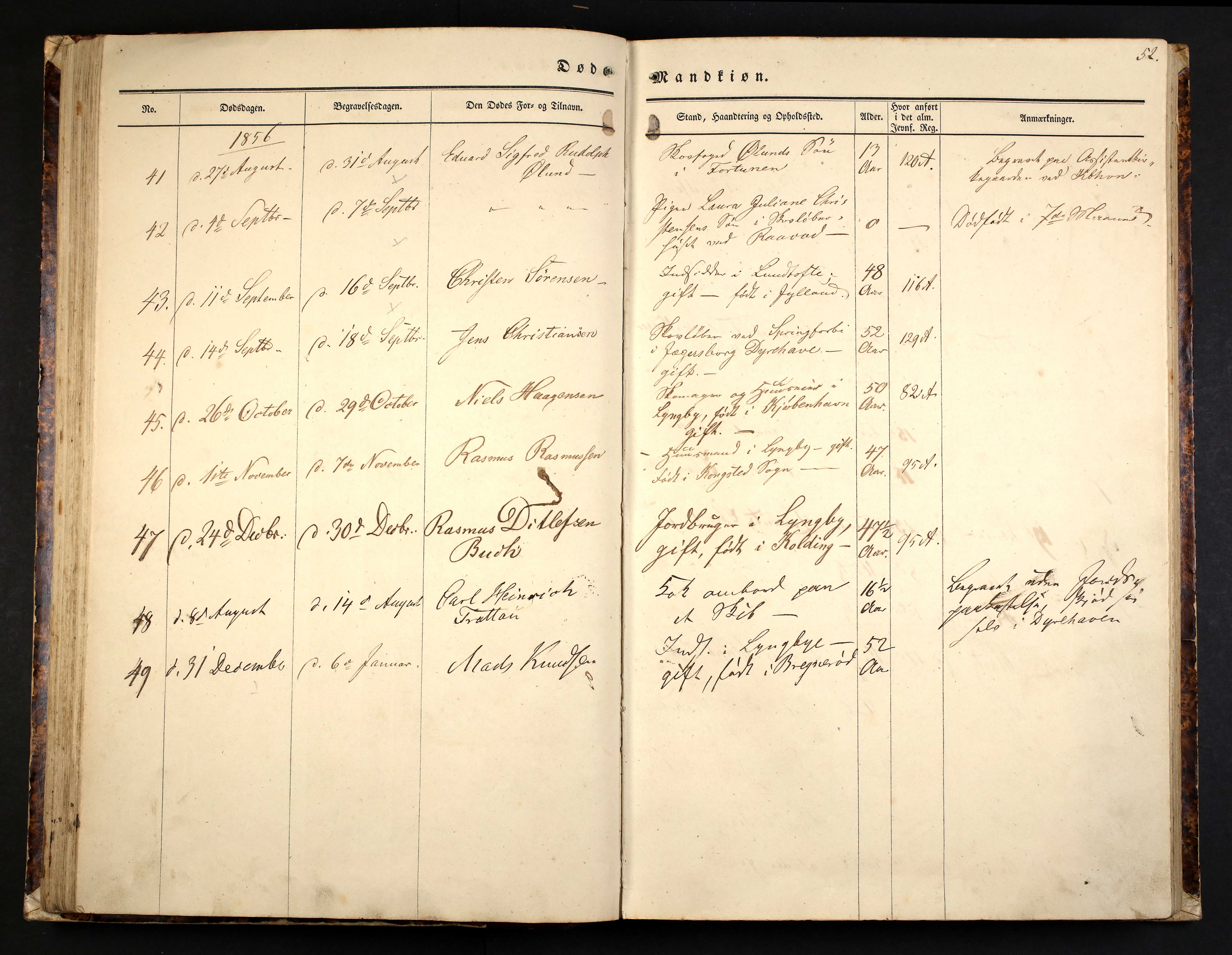 Kontraministerialbog, Kongens Lyngby, Sokkelund, Københavns Amt, Døde Mandkiøn 1844-1857, folio 52, nr. 47, 1856-12-30, Arkiv: Rigsarkivet, Arkivalier Online. Udarb. dato: 10 jun. 2025. Troværdighed: 4.