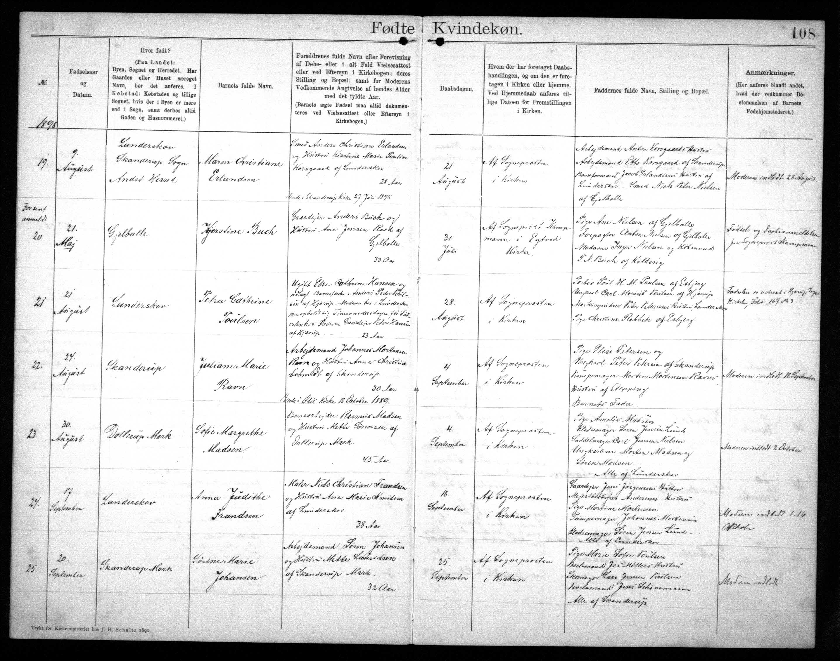 Kontraministerialbog 1892-1904, Skanderup, Anst, Ribe, Foedte Kvindekoen, side 108, nummer 20, 1898-07-31, Arkiv: Rigsarkivet, Arkivalier Online. Udarb. dato: 30 apr. 2021. Troværdighed: 4.
