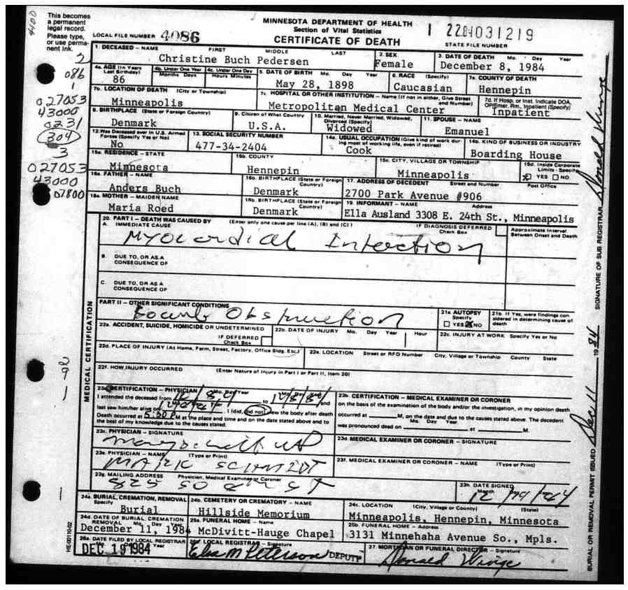 Death Certificate Index: 1984-MN-031219, Arkiv: Minnesota Historical Society. Udarb. dato: 1 maj 2021. Troværdighed: 4.
