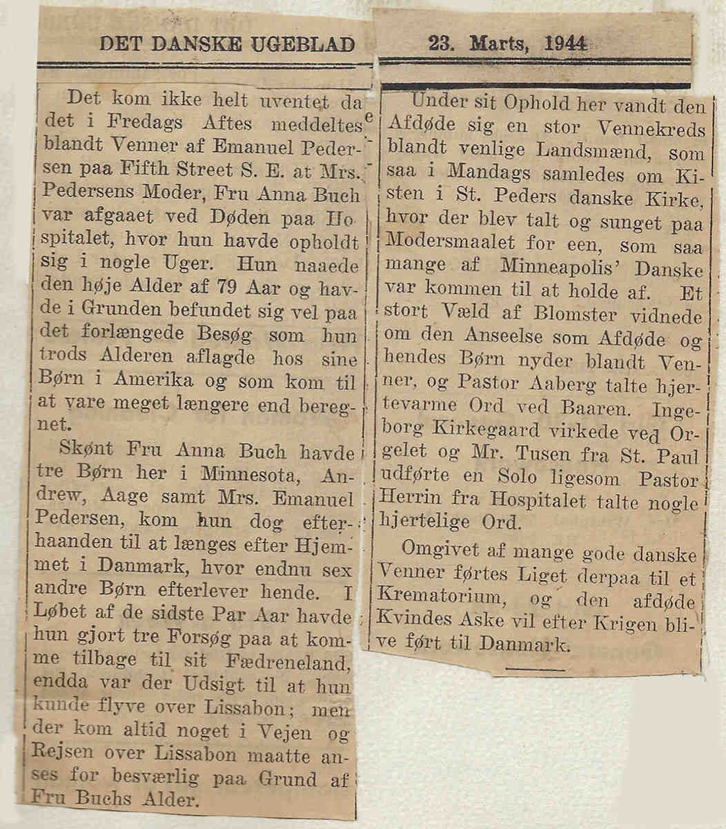 Skønt Fru Anna Buch havde tre Børn her i Minnesota, Andrew, Aage samt Mrs. Emanuel Pedersen, kom kun dog efterhaanden til at længes efter Hjemmet i Danmark, hvor endnu sex andre Børn efterlever hende. I Løbet af de sidste Par Aar havde hun gjort tre Forsøg paa at komme tilbage til sit Fædreland, endda var der Udsigt til at hun kunde flyve over Lissabon; men der kom altid noget i Vejen og Rejsen over Lissabon maatte anses for besværlig paa Grund af Fru Buchs Alder.