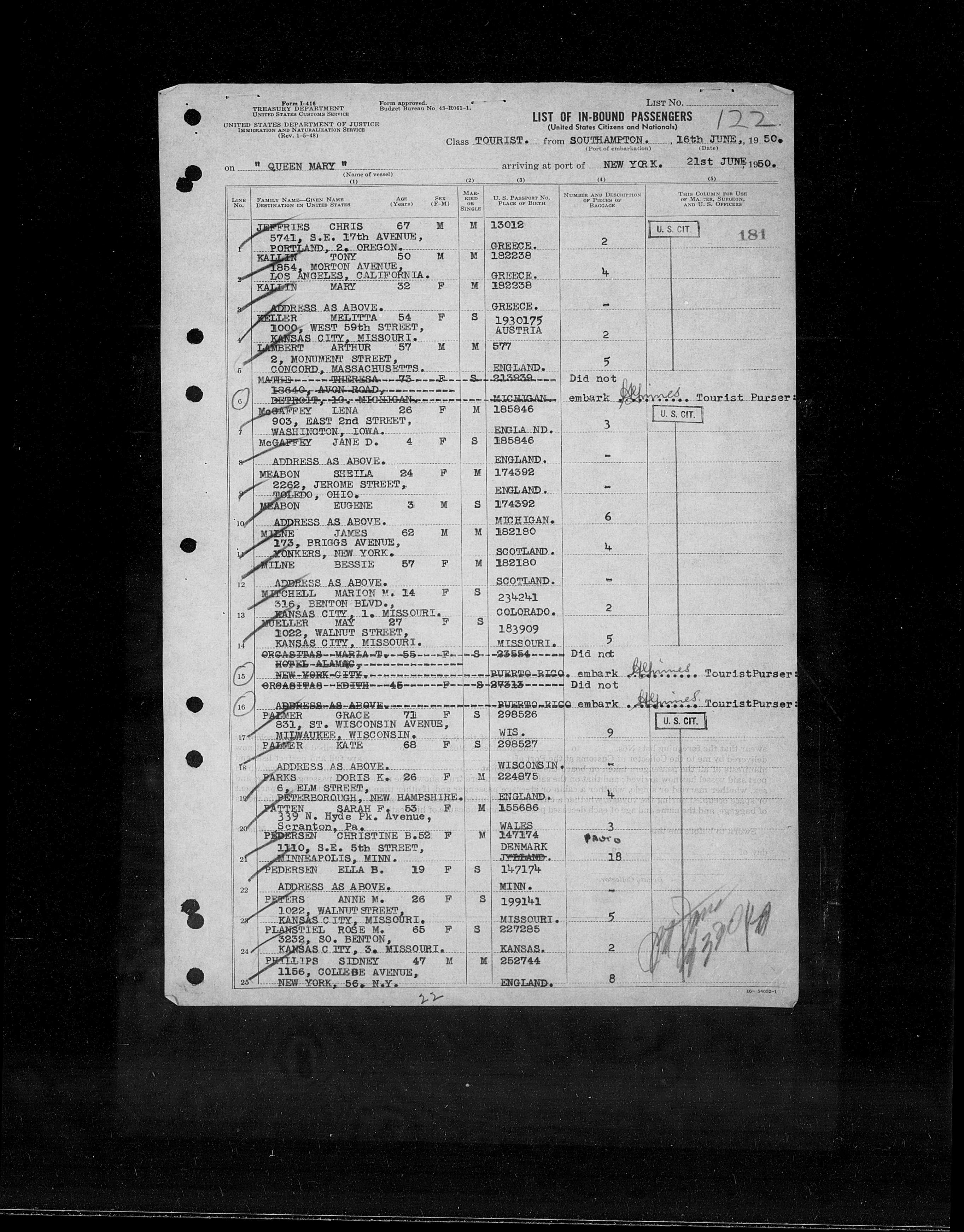 Ship Manifest, Queen Mary, ankomst til New York, 1950-06-21, side 122, Arkiv: FamilySearch. Udarb. dato: 30 apr. 2021. Troværdighed: 4.