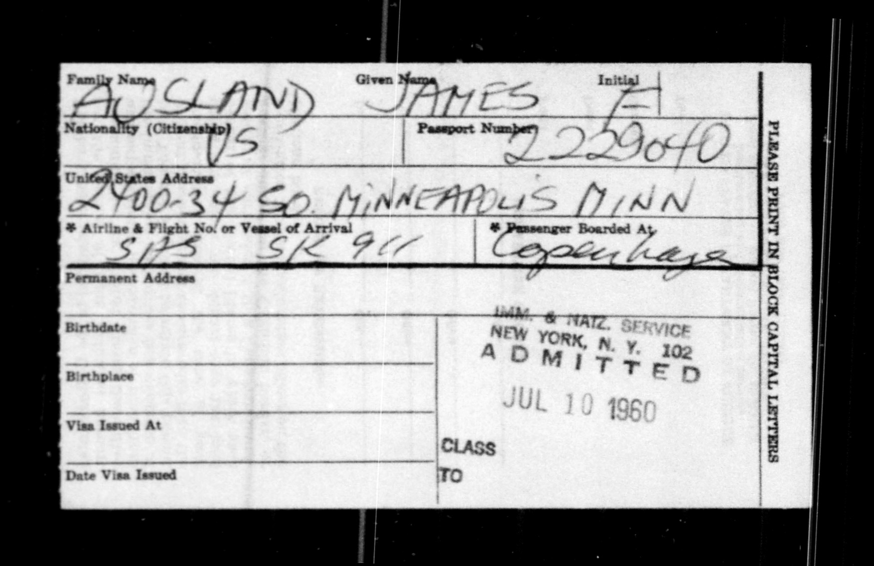 US INS, New York, flyankomster New York City, 1957-1962, 1960-07-10, James Frederick Ausland [190], Arkiv: MyHeritage. Udarb. dato: 28 mar. 2026. Troværdighed: 4.