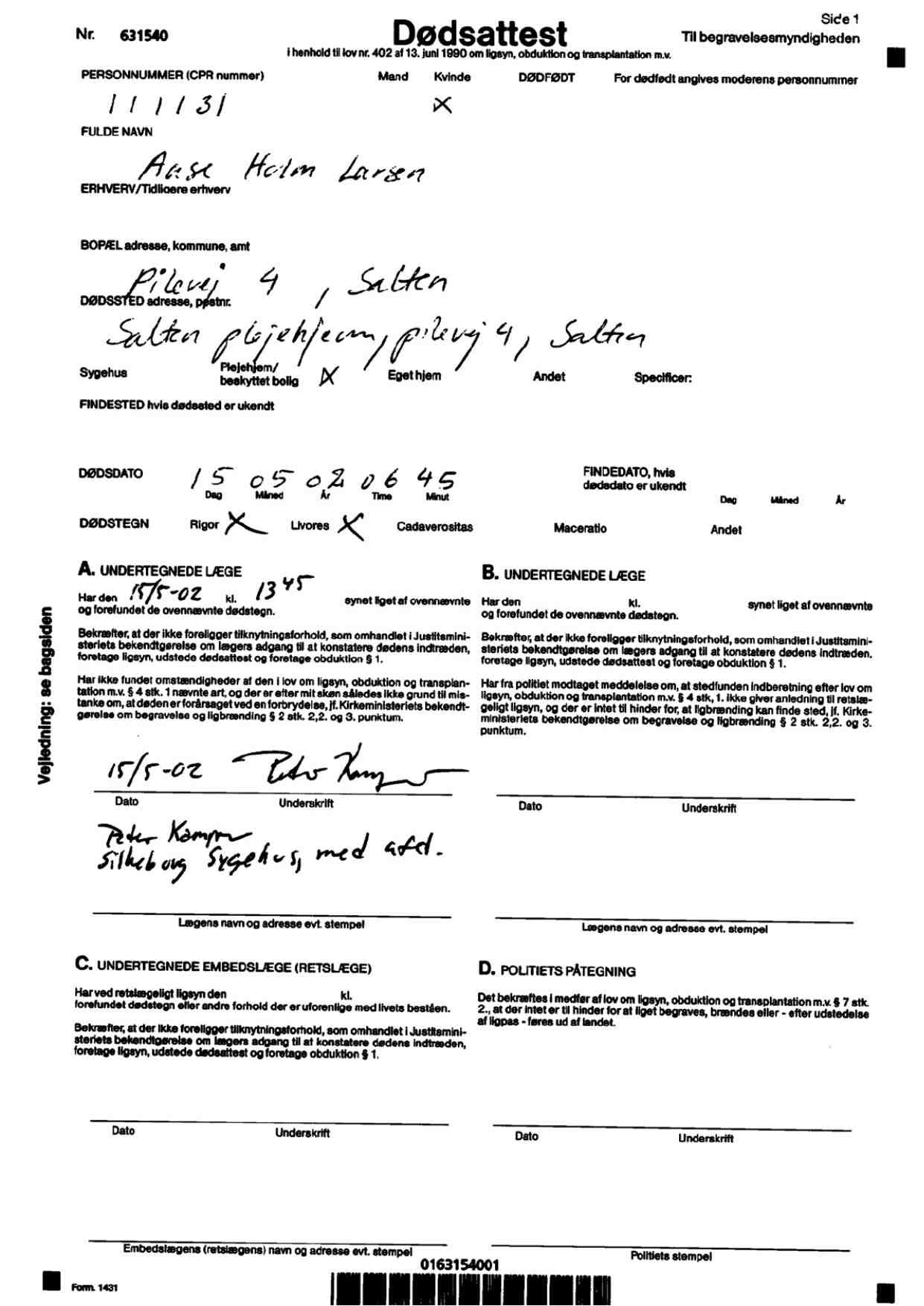 Dødsattest, Aase Holm Larsen, Dødsårsagen må ikke oplyses til mig, selv om jeg er hendes søn. Arkiv: Sundhedsdatastyrelsen. Udarb. dato: 3 maj 2021. Troværdighed: 4.