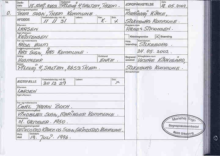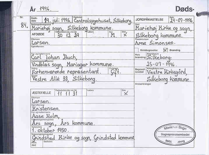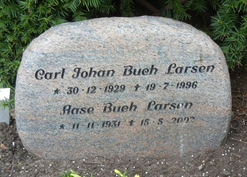 Dødsårsag: Akut maveblødning.10 Notater: Aase Buch Larsen Begravelsesnotater: Bisættelsen foregik fra Mariehøj Kirke, og urnen blev efterfølgende nedsat på Silkeborg Kirkegård. Om Aase: