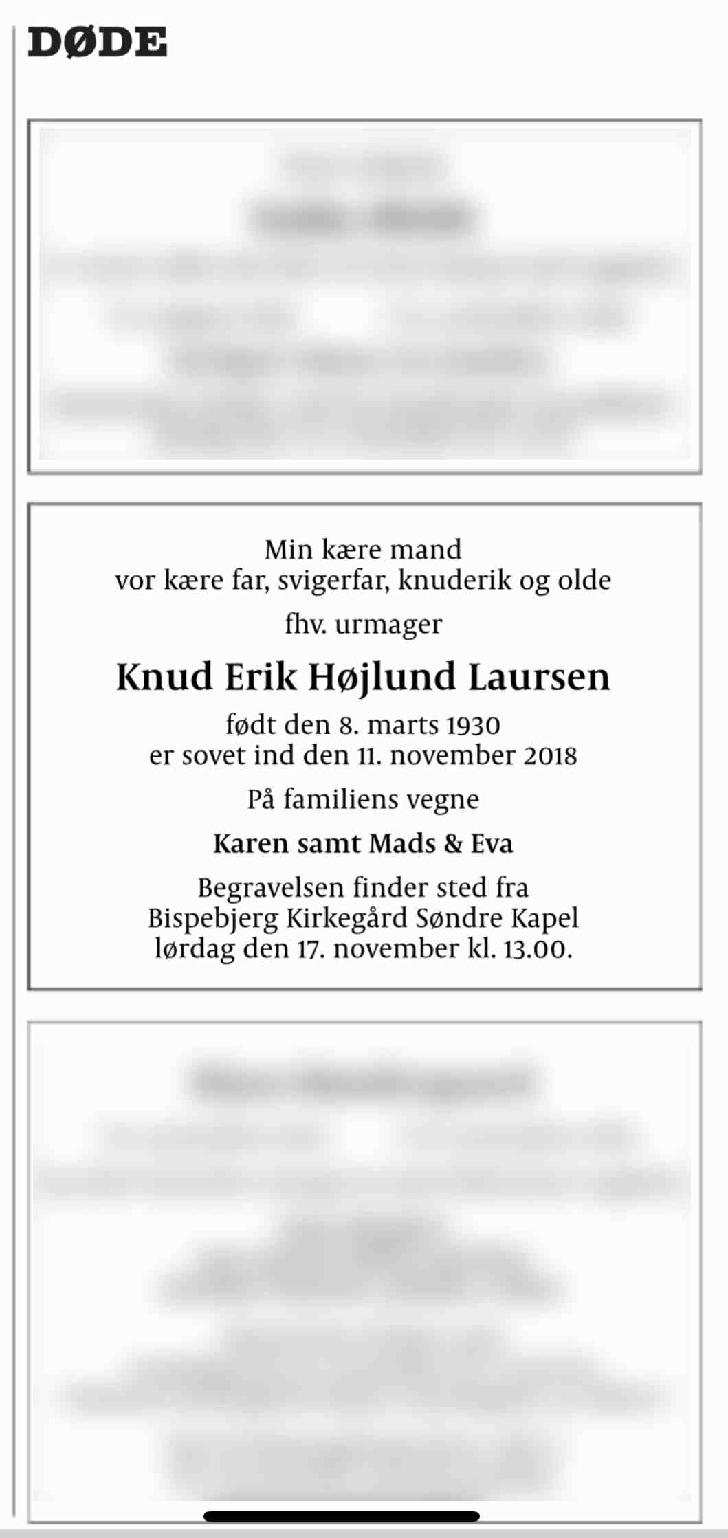 Knud Erik Højlund Laursen, dødsannonce 15. nov. 2018, Udarb. dato: 19 nov. 2018. Troværdighed: 4.