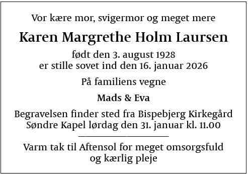 2026-01-27 Karen Margrethe Holm Laursen, dødsannonce i Politiken, Arkiv: Politiken.dk. Udarb. dato: 28 jan. 2026. Troværdighed: 4.