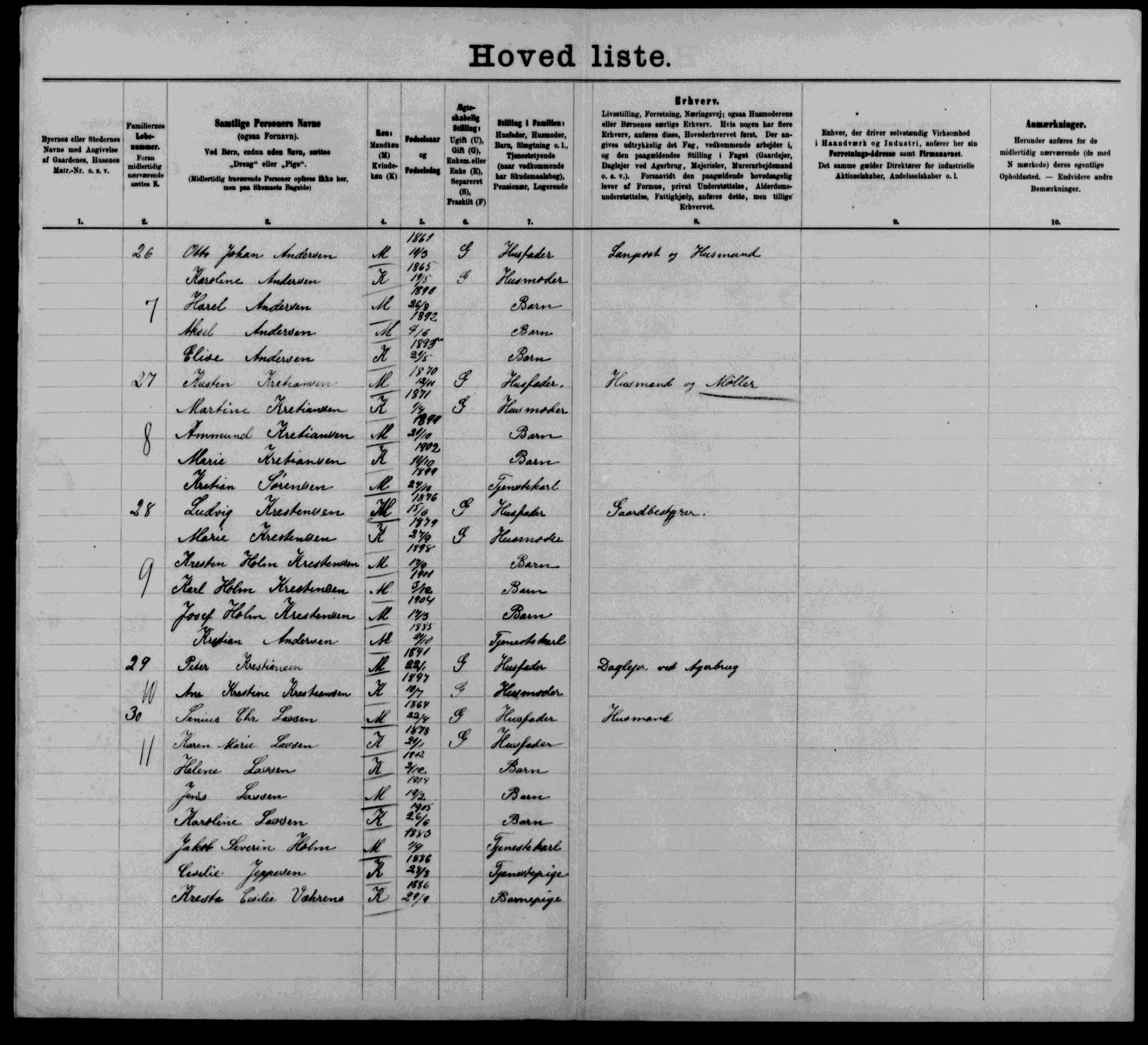 Folketælling 19060201, Skema No. 10, Hovedliste side 2, familie 28, Bindslev Sogn, Horns, Hjørring Amt, Som sædvanligt er der rod i stavemåden vedr. navnene. Udarb. dato: 25 okt. 2018. Troværdighed: 3.