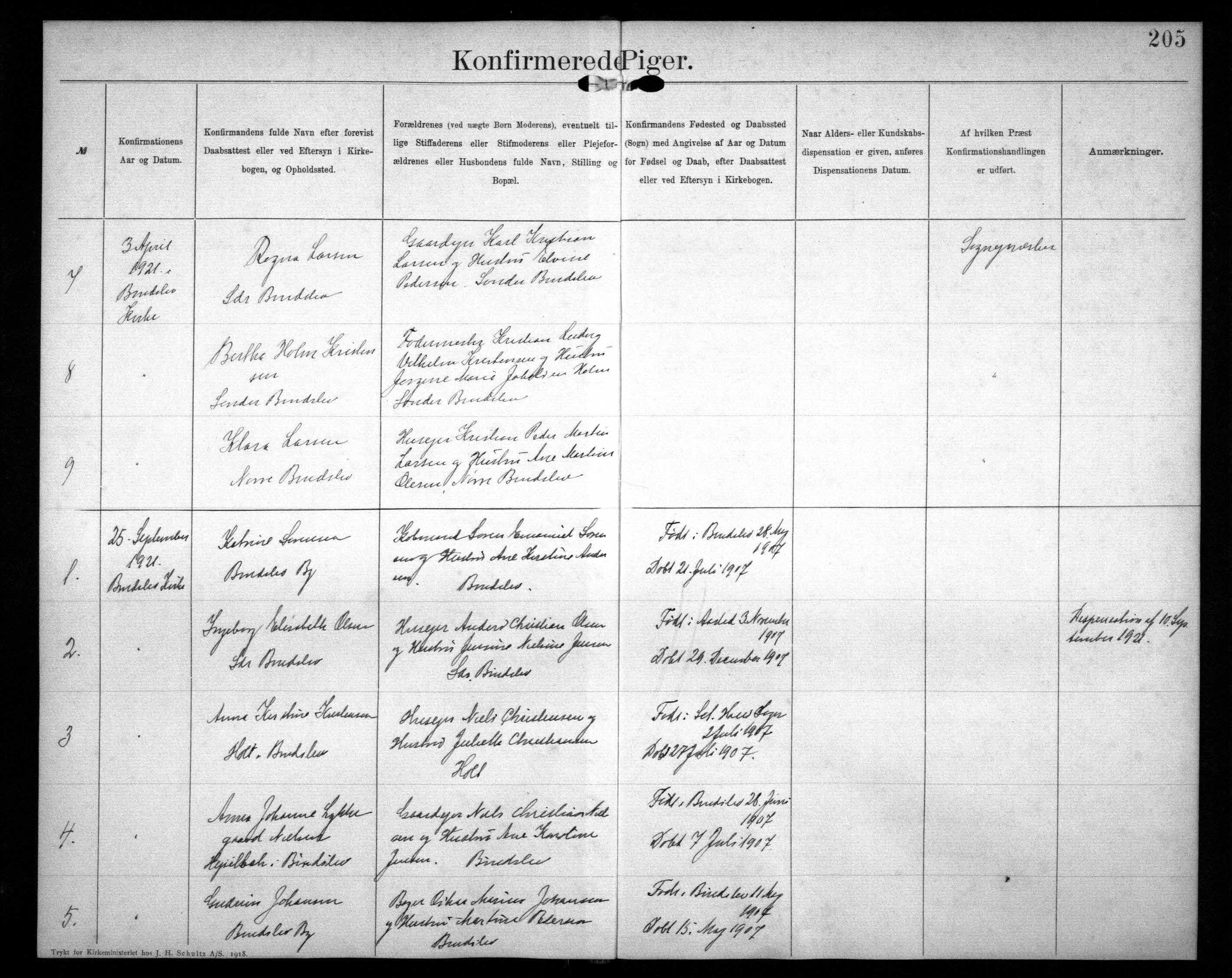 Kontraministerialbog, Bindslev, Horns, Hjørring Amt, Konfirmerede Piger 1920-1928, folio 205, nr. 7, 19210403, Arkiv: Rigsarkivet, Arkivalier Online. Udarb. dato: 4 mar. 2023. Troværdighed: 4.