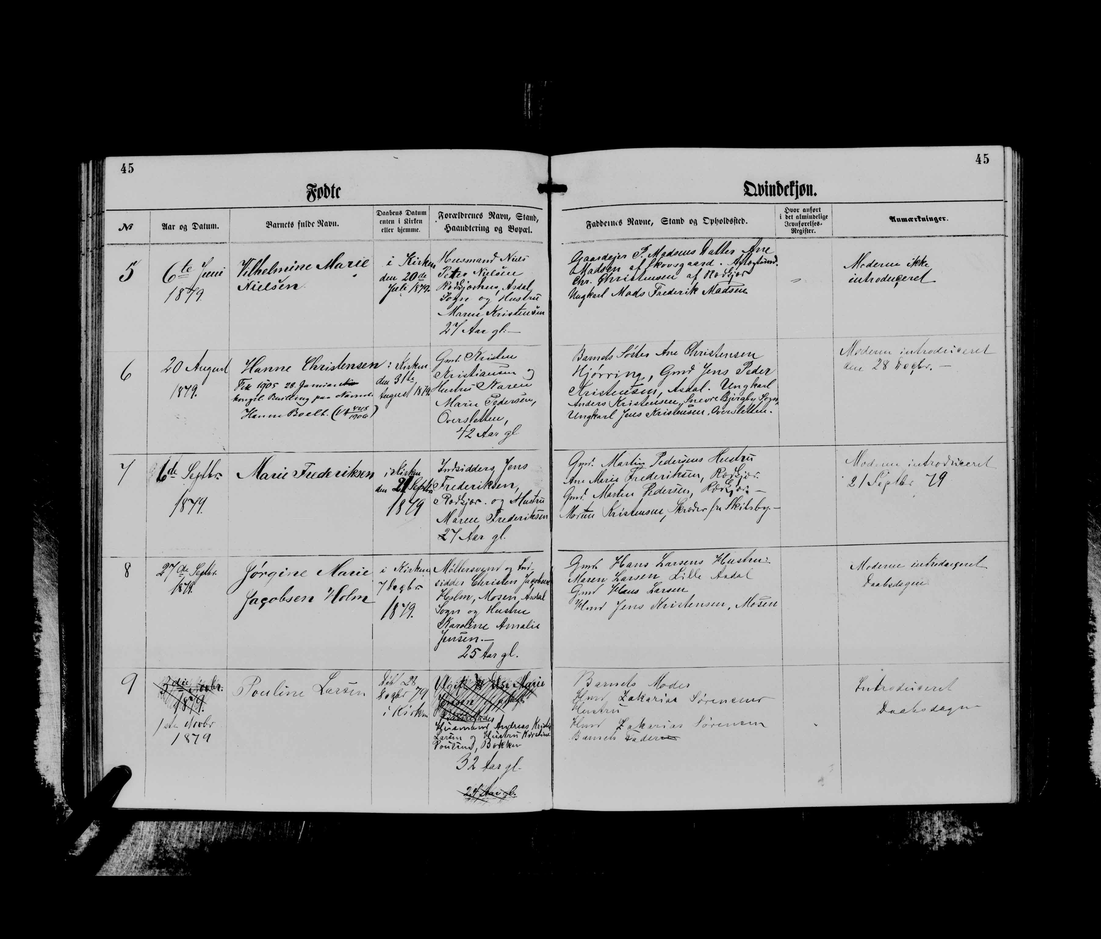 Kirkebog 1879, side 45, Asdal, Vennebjerg, Hjørring Amt, Udarb. dato: 24 okt. 2018. Troværdighed: 4. Faddere: "Gmd. [gårdmand] Hans Larsens Hustru, Maren Larsen, Lille Aadal, Gmd . Hans Larsen, Hmd. [husmand?] Jens Kristensen, Mosen".