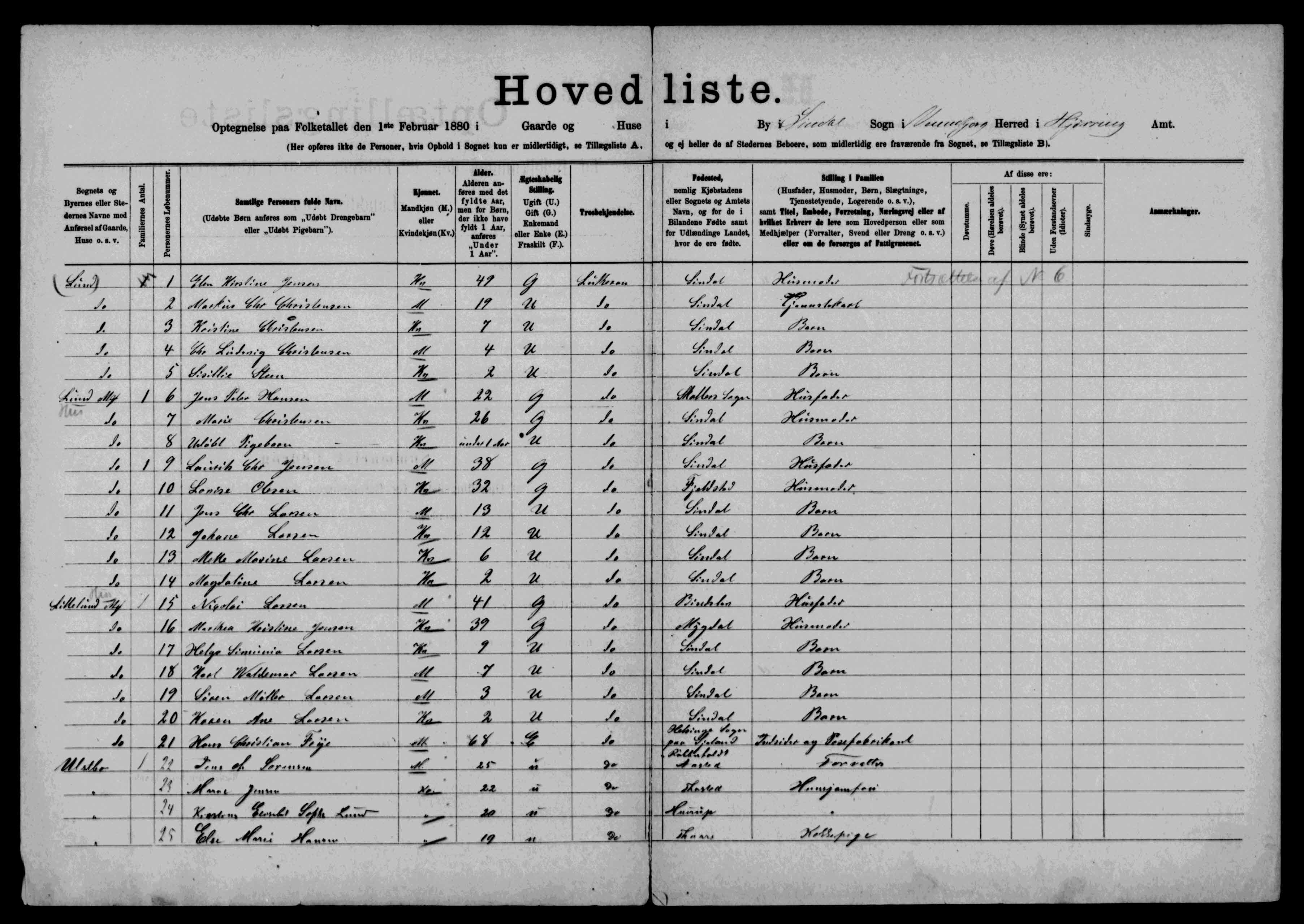 Folketælling 18800201, Optællingsliste no. 4, Hovedliste, opslag 23, Sindal, Vennebjerg, Hjørring Amt, Én ting er, at navnet er stavet forkert, men fødestedet er anført som Sindal i stedet for Vennebjerg. Arkiv: Rigsarkivet, Arkivalier Online. Udarb. dato: 18 jan. 2022. Troværdighed: 1.